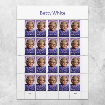 About the stamp design: The portrait of Betty White based on a 2010 photo by Kwaku Alston was created digitally by Dale Stephanos. Greg Breeding designed the stamp, which pictures the star in a blue polka-dot top. The violet background with light purple bubbles captures White??s bright and joyful personality that made her a Hollywood mainstay for decades.