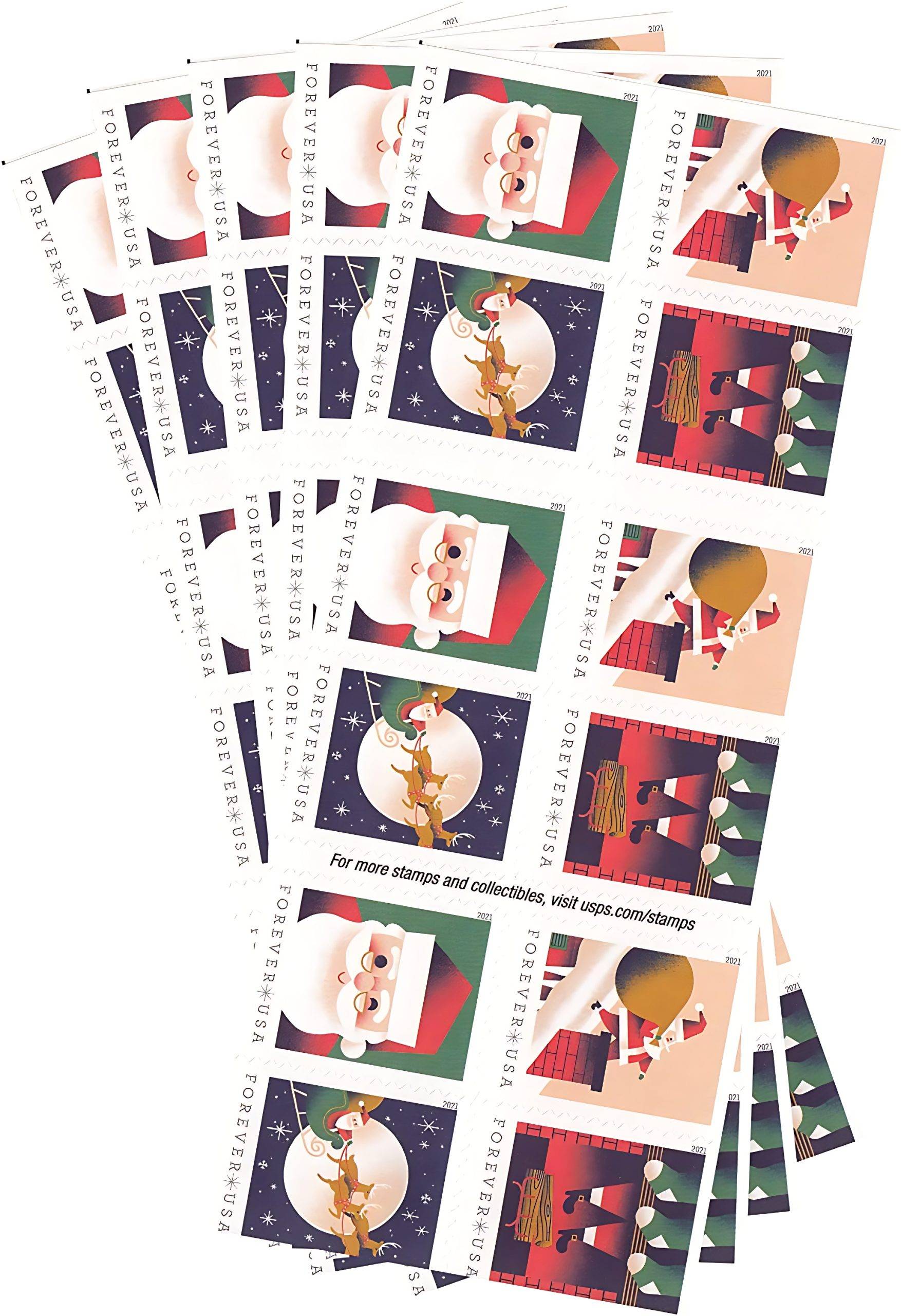 In 2021, the United States Postal Service issued a set of four Forever Stamps picturing different scenes from the classic Christmas poem “A Visit From St. Nicholas.” ?The set was even named after the poem, though shortened slightly to A Visit From St. Nick. ?The Stamps picture St. Nicholas on a roof about to go down a chimney, a fireplace with stockings, St. Nicholas winking, and a view of him flying across the sky in his sleigh.